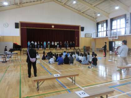体育館で、発表する曲のグループごとに練習の成果を披露し、お互いの発表を鑑賞しあい、いいところやアドバイスを伝え合いました。こうした時間を通して、よりよい演奏、発表につなげていきます。