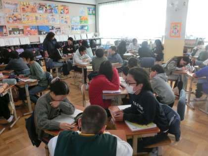 国語科では「『鳥獣戯画』を読む」の学習で、相談しながら学習計画を立てました。筆者の表現の工夫を意識して読み進め、自分が書く際に生かしていきます。