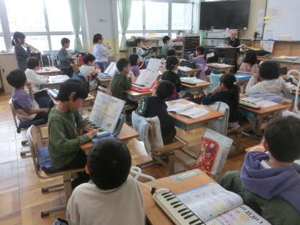 音楽科では「ド、レ、ミ、ファ、ソ」の音を使った曲を、けんばんハーモニカで演奏したり、演奏にあわせて歌ったりしました。