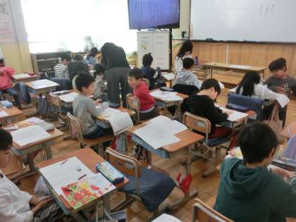 国語科「みきのたからもの」の学習では、つなぎことばを使って、お話のあらすじをまとめました。お話の紹介文につなげていく学習です。