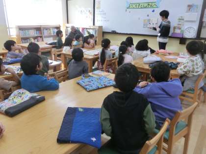 また図書館では、司書の先生の読聞かせを楽しみました。みんなお話の世界に入り込み、前のめりで聞いていました。
