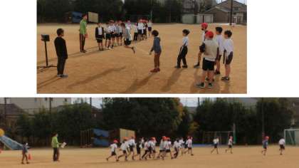 体育科は「なわとび&ゆっくりペース走」。ひとりでのなわとびと大なわでの八の字で身体を温めたあと、ペース走に臨みました。