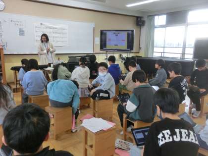 音楽科では、音色に着目して鑑賞を行いました。音色のかたさ・やわらかさや、ひびきの長さ・短さを意識して鑑賞しました。