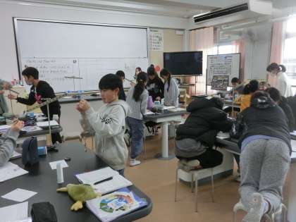 理科では「てこが水平につり合うときには、どんなきまりがあるのだろうか」というめあてで、実験を行い、気づきを交流し、まとめました。条件整備をしながら実験することも身についています。