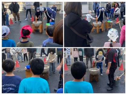 今日は、少年補導紫野支部主催、民生児童委員会・紫野キッズサポーターの協賛、またおやじの会や少年補導楽只支部等の皆様のご協力で、餅つき大会が行われました。素晴らしいお天気のもと多くの子どもたちが参加し、「よいしょ!よいしょ!」の声とともに餅つきで盛り上がりました。そのあとにはきなこやぜんざいなどで、つきたての美味しいおもちをいただきました。