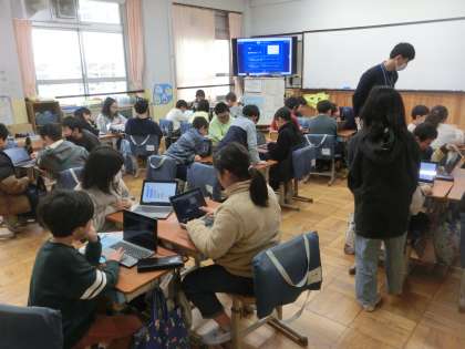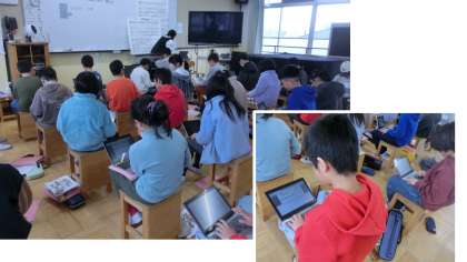 音楽科では、日本に古くから伝わる楽器を使った曲を鑑賞しました。三味線や三線(さんしん)を使った音楽を鑑賞し、ロイロノートにまとめて交流しました。