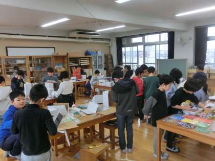 図画工作科では「おもしろダンボールボックス」を作っています。使いたい場面を考えながら、工夫を凝らしています。