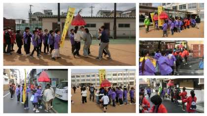 4年生はこれまで紫野タイム(総合的な学習の時間)に、玄武やすらい祭について学習を進めてきました。今日はその集大成。約2か月間練習を積み重ねてきた「やすらい、はなや」の掛け声、おどり、笛・鐘・太鼓の音色を響かせて、校内・校区を回りました。お天気が心配されましたが、関わるみんなの気持ちが伝わり、大きく天気が崩れることなく実施することができました。