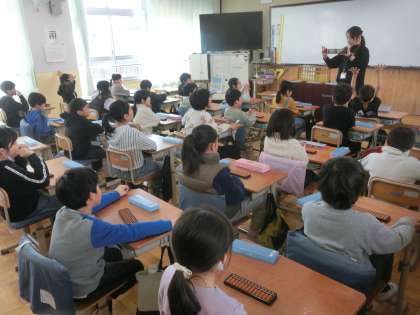 算数科では、そろばんの学習を行いました。初めてそろばんに触れる人もいて、目がキラキラと輝いています。