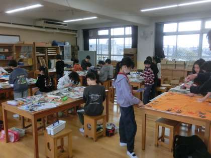 図画工作科では、作品づくりと並行して、学級旗も作成しました。自主・自律・自治を意識し、山の家の活動にも備えます。みんなの手形が素敵です。