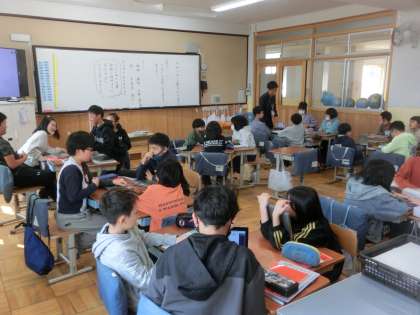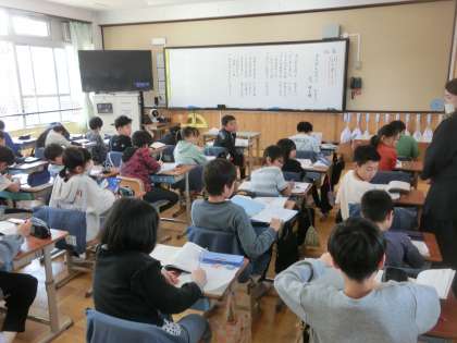 国語科では、ひみつの言葉を引き出そうの学習です。お互いにイメージした言葉を自然に引き出せるよう、頭をひねりました。また、「詩を楽しもう」の学習では「かんがえるのって おもしろい」という詩を通して、「考える」ことについて考えました。