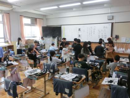 書写では毛筆で「花」と書きました。点画の筆づかいを意識して取り組みます。