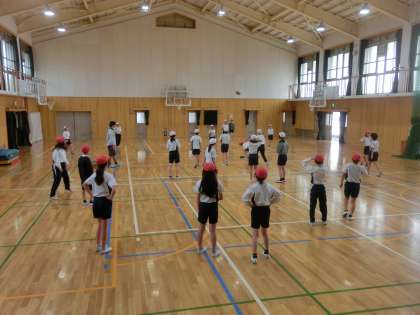 体育科では、体慣らしの運動でドッジビーを行いました。ドッジボールとはまた違うスピード感や変化を楽しみながら運動をすることができました。