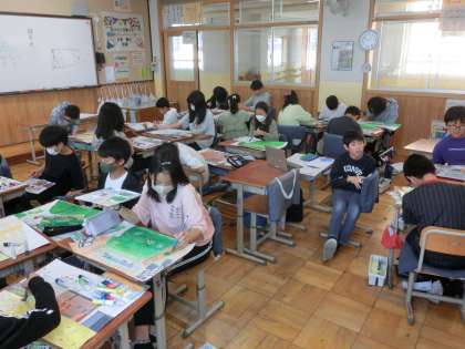 図画工作科では、校内の好きな場所の風景を描いています。その場所を直接見たり、写真で見たりしながら、彩色しています。