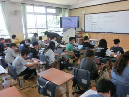 算数科では、文字を使った式の単元の学びのまとめに取り組みました。問題や答えをノートにまとめたり、端末のデジタルドリルで振り返ったりしています。