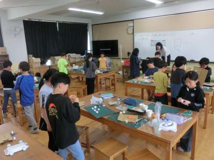 図画工作科では「ゴムでゴー!ゴー!ゆめの乗り物」の学習で、動く車の土台作りを行いました。それぞれに工程を工夫して作業しました。