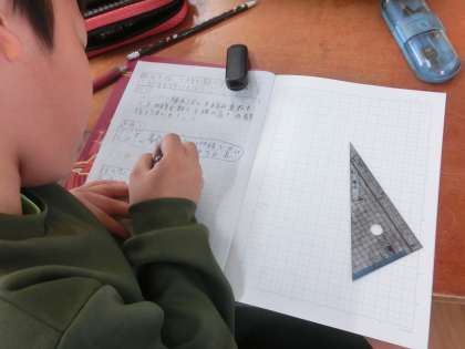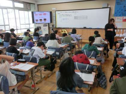 算数科では、表を用いて、ともなって変わるふたつの量の関係性をとらえる学習に取り組みました。問題文を丁寧に読み、表を使って法則性を見つけ出します。