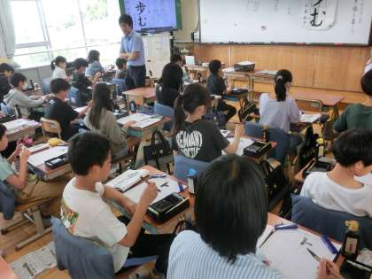 毛筆書写では、字の大きさのバランスや中心を意識して「歩む」と書きました。一歩一歩踏みしめるように歩んでほしいです。