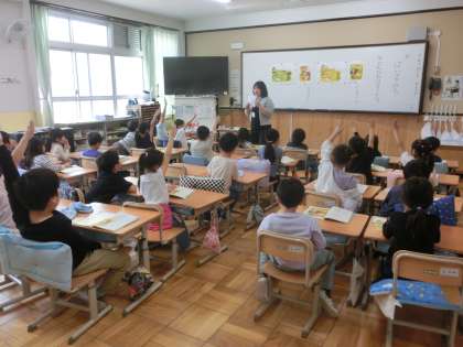国語科では「はなのみち」の学習です。挿絵をみて、どんなお話かな…?などと想像し、思ったことを出し合いました。お話を読み進めるのが楽しみです。