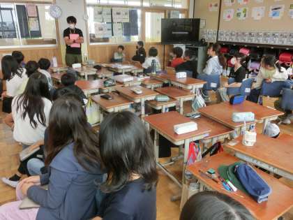 国語科「聞いて、考えを深めよう」の学習では、インタビューしたことをもとに、発表会を行いました。自分の考えと比べながら聞くことで、自分の考えをさらに深めます。