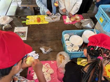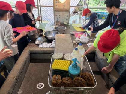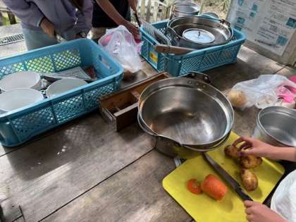 野外炊事、カレーづくりが始まりました。安全を確認しながら、それぞれの役割でがんばります!