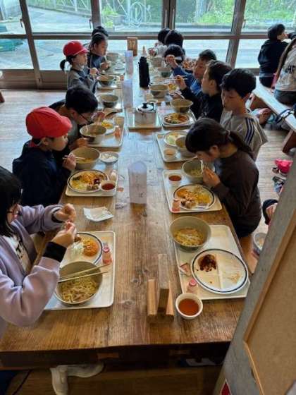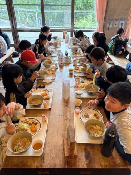 お昼のメインはラーメン。人気のおかずはシュウマイです。しっかり食べて、午後の活動に備えます。