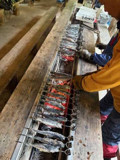 並行して山の家の先生が、魚を焼いてくださっています。本格炭火焼き。めちゃくちゃ美味しそうてす。