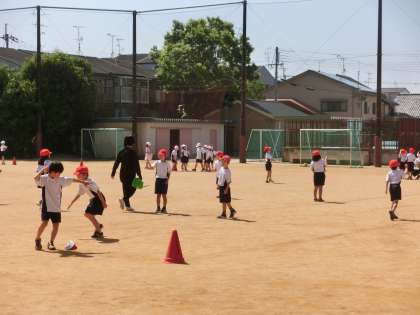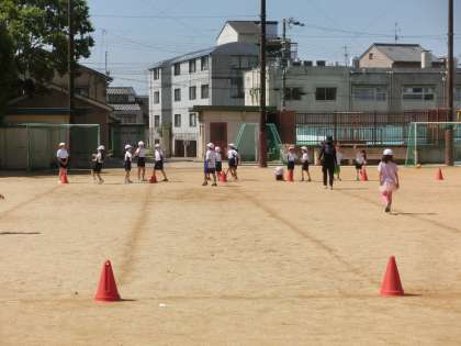 体育科「とびあそび」の学習です。大きな一歩でぴょんぴょんと軽やかに跳びました。
