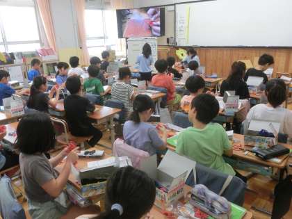 理科では。電気のはたらきを調べる実験装置を組み立てました。これからの学習の中で、様々な実験に活用します。