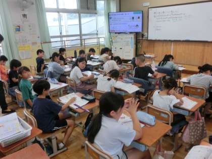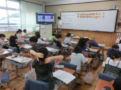 算数科では「10倍にした数」について考えました。20円の鉛筆が10本あると全部でいくらかな…など、生活の中でもよく出てくる考えですね。活発に考えが出し合われました。