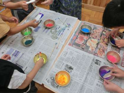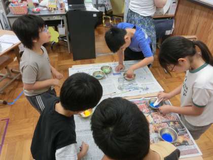 図画工作科では、紙を折って色ぞめをしました。カラフルできれいな作品ができました。