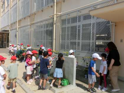 アサガオの水やりをしています。もう咲いている!ツルが長い!もう少しかな…などと感想を話しながら、アサガオの生長を観察し、お世話を続けていきます。