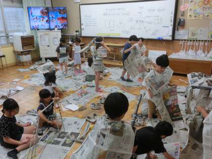 図画工作科「しんぶんと なかよし」の活動です。重ねたり丸めたり、たたんだりかぶったり…。イメージを膨らませ、新聞紙が色々なものにすがたを変えます。2年生の想像力、すごいです!