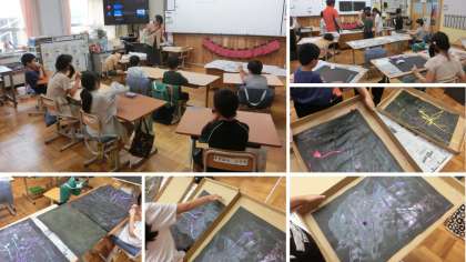 図画工作科「コロコロビー玉もよう」に取り組みました。まずは台紙をラメ入りの画材で彩り、その上で絵の具をつけたビー玉を転がして、作品をつくります。偶然性も楽しみのひとつです。