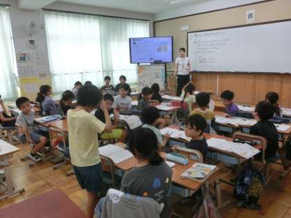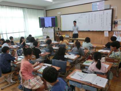 算数科のわり算の学習では、文章題に挑戦。あまりの部分も意識して答えを導くときにはどんなことに気をつければいいのか、みんなで考えました。