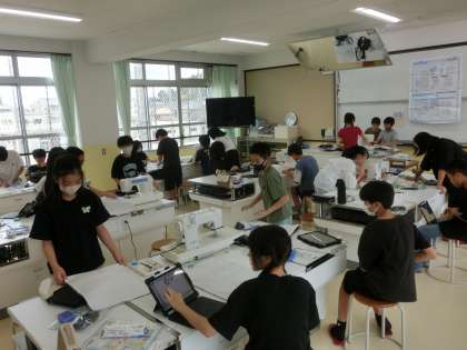 家庭科では、ミシンを使ってナップザックを作っています。友だちと協力しながら、温かい雰囲気で取り組んでいる姿、素敵です。