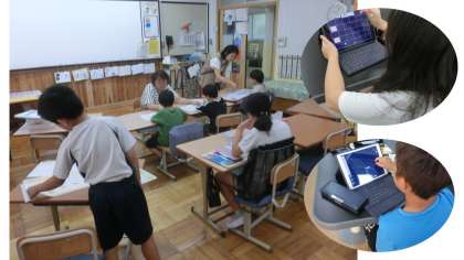 教室ではひらがなやカタカナなどの学習、各学年の教科の学習など、各々の課題に取り組みました。交流の理科の時間には、ロイロノートを活用して学習しています。
