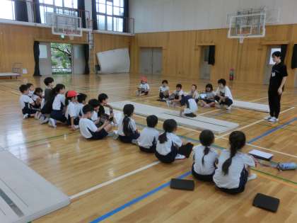 体育科では、マット運動に取り組んでいます。お互いの技を見合ったり、動画撮影したりし、技をみがいています。