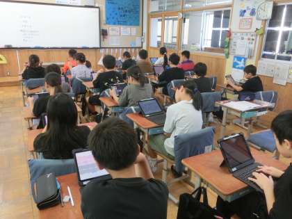 体育科では、ソフトバレーボールに取り組んでいます。学習の後には、ロイロノートを用いて振り返りや学習のまとめを行っています。