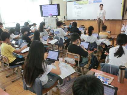 外国語では、世界の生きたい国について伝え合います。端末を使ったクイズで、表現を確認する学習も。とても楽しそうです。