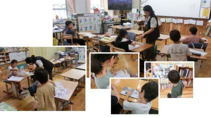 教室で個別の課題に取り組んだり、交流学級で活動したりしている様子です。運動会などの行事が近づくと、ばらばらで活動することが増えてきます。そろったときには、たくさんお話をする様子が見られます。