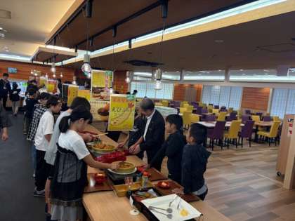 起床・身支度から、朝食会場にやってきました。ご当地メニューが充実したバイキングです。何を食べようかな…と選ぶのも楽しそうです。