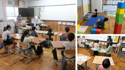 朝の会はみんな揃って行い、放送での児童朝会に耳を傾けました。その後は教室や交流での活動。重さしらべで1kgを体感したり、造形あそびを楽しんだりしました。