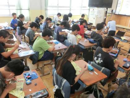 家庭科「ひと針に心をこめて」の学習です。裁縫の実習に取り組んでいきます。まずは道具の扱いを確認し、練習布を使って基本の縫い方やボタン付けを練習しています。