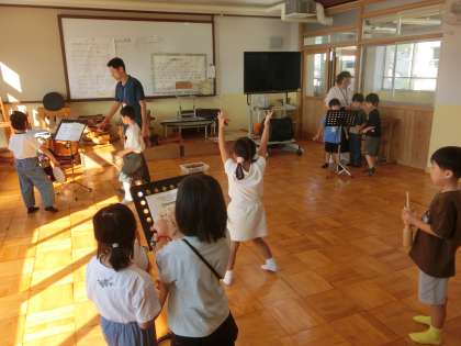 音楽科「がっきと なかよくなろう」では、絵を見て思い浮かべた音で音楽を創ります。どんな音がいいかな…と楽しく活動しました。
