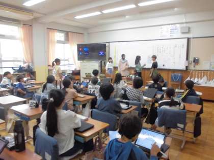 4年生では、総合的な学習で行っている福祉について今後の進め方を学級討論会をしながら考えています。子どもたちから議長や書記などをつとめ、自分たちの考えをまとめたり、提案、質問したりと活発な議論の中で進めています。