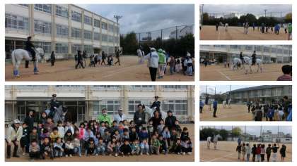 平安騎馬隊のお馬さんと一緒に交通安全教室を行いました。横断歩道の渡り方を確認しました。最後は記念に、みんなで写真を撮ってお見送りしました。地域交通安全対策協議会の皆様をはじめ、多くの皆様にお世話になり、ありがとうございました。