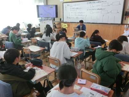 算数科では図形の拡大や縮小について学習しています。縮図を用いて実際の距離を求める問題にも取り組みました。