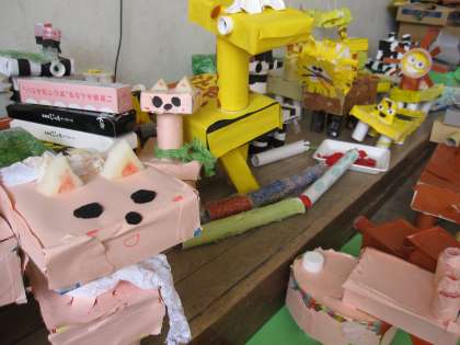 1年生の隣にある生活科ルームにたくさんのかわいい動物が集まりだしました。ライオン,ゾウ,キリン,ネコ,ヘビも・・・。船岡山からやってきたのかと思いきや,1年生が図画工作科の時間に作っている作品たちでした。きらきらと目を輝かせたり首を少しまげたり,とてもかわいらしいしぐさの作品ばかりです。3月の作品展ではかわいい動物園が開園しそうです。