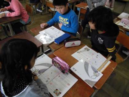3年生は算数でかけ算のきまりについて学習しました。2年生のときに学習したかけ算の九九を使って,表にあてはまる数字を考えました。九九の表の決まりを見つけた子どもたちは「わかった!」「ここには○○があてはまる。」と,意欲的に取り組むことができました。授業の後半では2人組になって『数あてゲーム』をしました。みんな楽しんで算数に取り組むことができました。